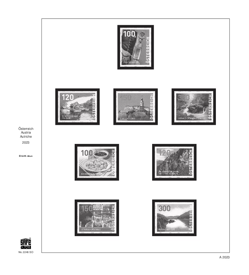Les suppléments avec feuilles préimprimées de Safe, de type Dual, sont fabriquées en carton particulièrement solide, sans bois et résistant au vieillissement d'un poids de 170 gr/m2. Ces feuilles de haute qualité sont de couleur Champagne et sont pourvues de bandes à pochettes transparentes sans acide ni plastifiant protègent vos timbres, carnets de timbres, feuillets, etc. de manière optimale contre les influences extérieures, sans gêner la vue sur votre collection.