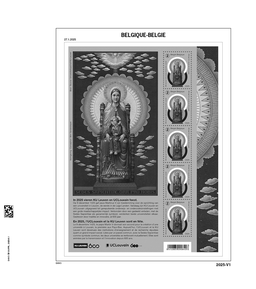 Les suppléments avec feuilles préimprimées de Davo, de type DeLuxe, sont fabriquées en carton particulièrement solide, sans bois et résistant au vieillissement d'un poids de 170 gr/m2. Ces feuilles de haute qualité sont de couleur Blanc et sont pourvues de bandes à pochettes transparentes sans acide ni plastifiant protègent vos timbres, carnets de timbres, feuillets, etc. de manière optimale contre les influences extérieures, sans gêner la vue sur votre collection.