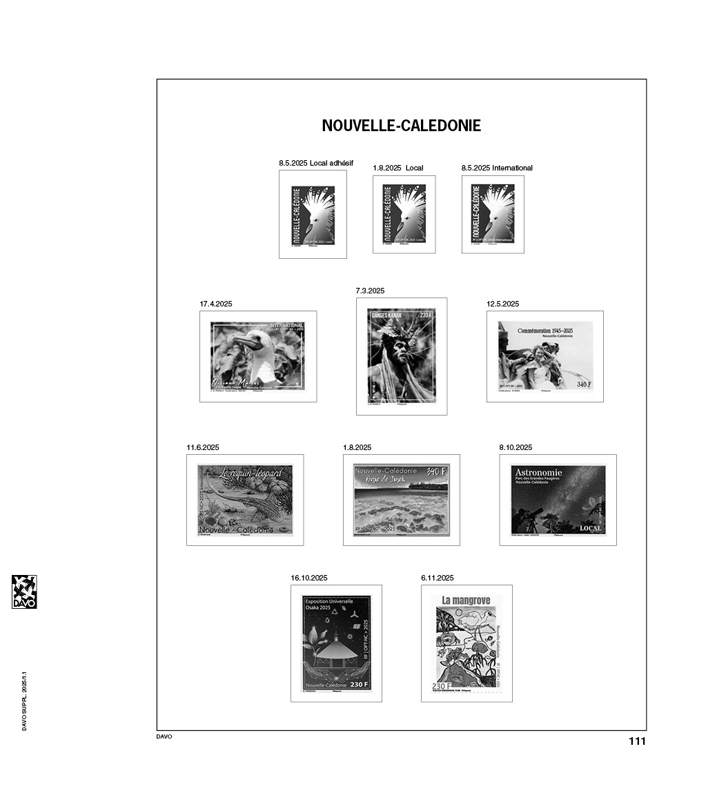 Découvrez dès maintenant la vaste gamme d'albums et de feuilles de Davo. Outre l'offre de Nouvelle-Calédonie vous trouverez également chez nous une large gamme de feuilles préimprimées, de suppléments et d'albums d'autres pays, éventuellement pourvus du drapeau national ou des armoiries nationales. Tous ces articles sont classés par pays dans la rubrique Aperçu des pays dans notre boutique en ligne. Nous avons souvent en stock des articles légèrement utilisés, mais en bon état.