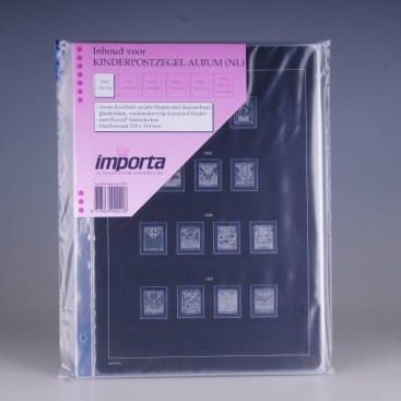 Les Feuilles pré-imprimées de Importa sont fabriquées en carton très stable, sans bois et résistant au vieillissement (250 gr/m2) dans la couleur Noir, dotées de Bandes à pochettes antireflet sans acide et sans plastifiant. Les feuilles au format 237 x 315 mm, sont munies d'une pochette de protection transparente (sans acide ni plastifiant) à 4 trous, convenant aux albums de timbres-poste pour enfants à 4 anneaux.