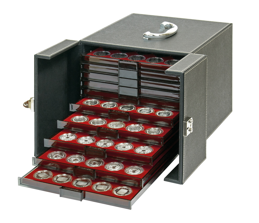 Valisette verrouillable avec surface finement structurée aspect cuir, conçue pour le rangement sécurisé de boîtes à monnaies. Cette version NERA MB 10 associe un aménagement intérieur pratique à une construction robuste pour une protection fiable de votre collection.