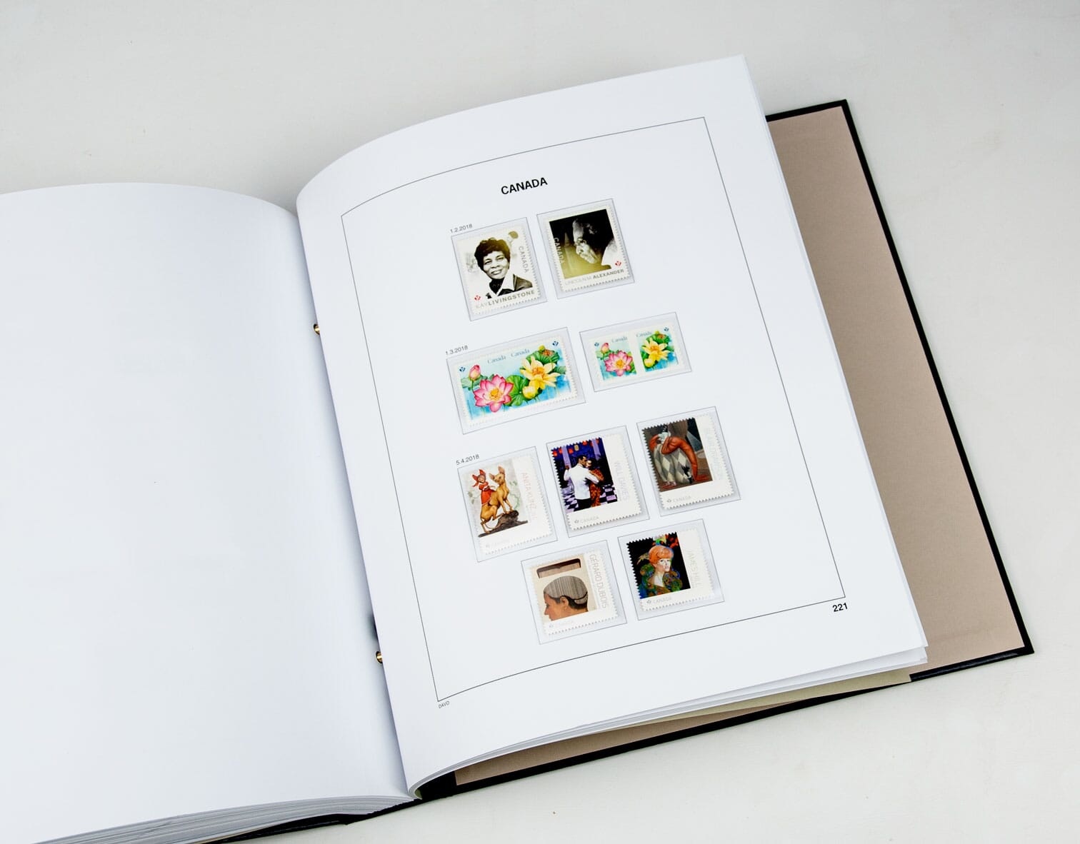 Op alle bladen zijn kaders aangegeven waar u de postzegels kunt onderbrengen, meestal met een afbeelding van de postzegel zelf. Op al deze kaders zijn transparante klemstrookjes aangebracht om uw postzegels veilig in onder te brengen.Het supplement Canada bevat het jaar 2018.
