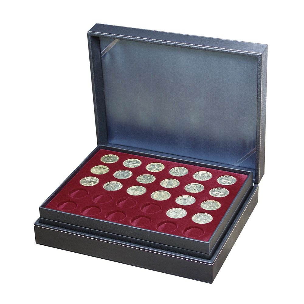 Aan de buitenzijde is deze luxe muntencassette voorzien van sierstiknaden.