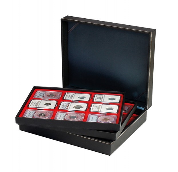 Handgemaakt met precisie en hoge kwaliteit - bekleed met een zwart stijlvolle generfd kunstleder. De trays voor de cassettes zijn voorzien van velours inzetstukken. Hert interieur van de deksel is voorzien van een antracietkleurig kussen.