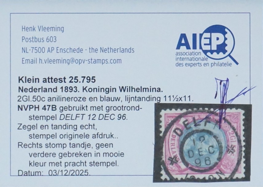 NVPH - 47 B, Postzegel (Nederland), Uitgegeven in de jaren: 1893-1896, Gestempeld (U) - Attest