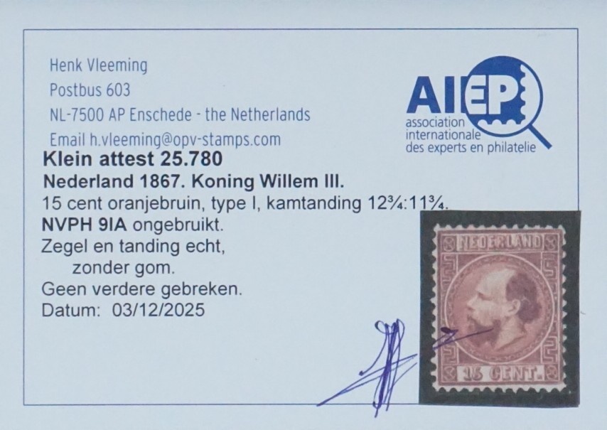NVPH - 9 IA, Postzegel (Nederland), Uitgegeven in de jaren: 1867-1868, Ongebruikt zonder gom (MNG) - Attest
