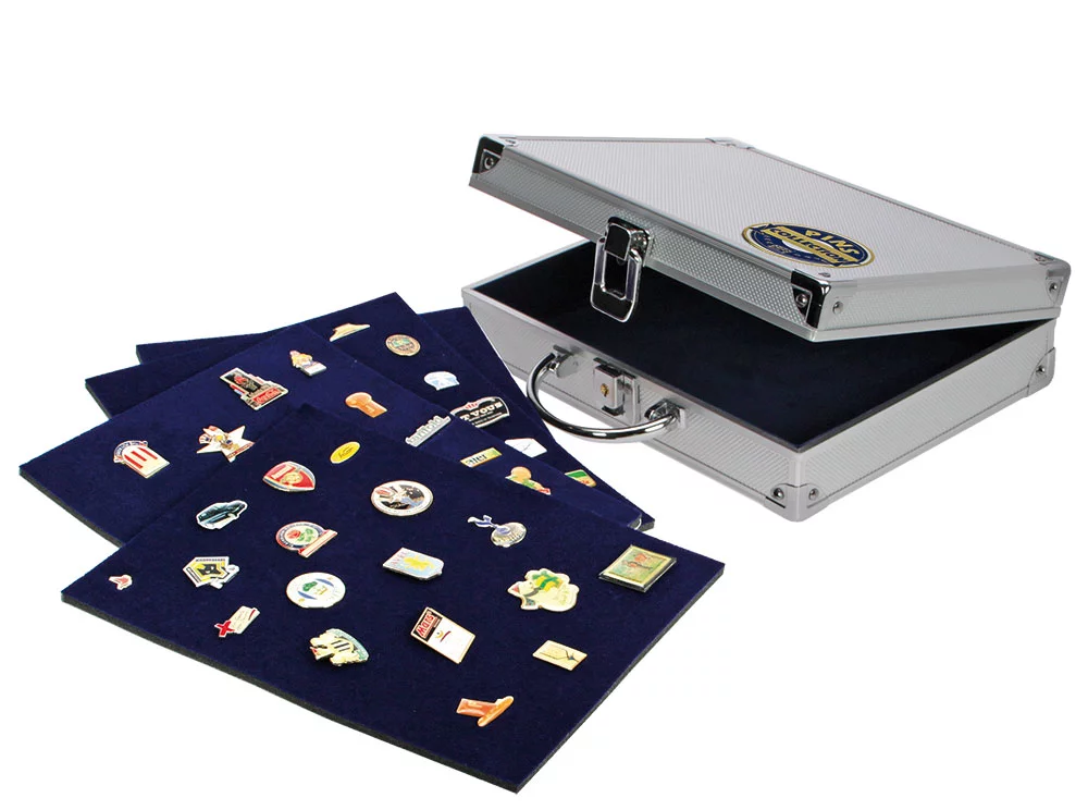 Wordt geleverd met 3 donkerblauwe velours inzet tableaus voor medailles of spelden, tevens de daarbij passende transparante beschermhoezen. Capaciteit is ongeveer 120 spelden.