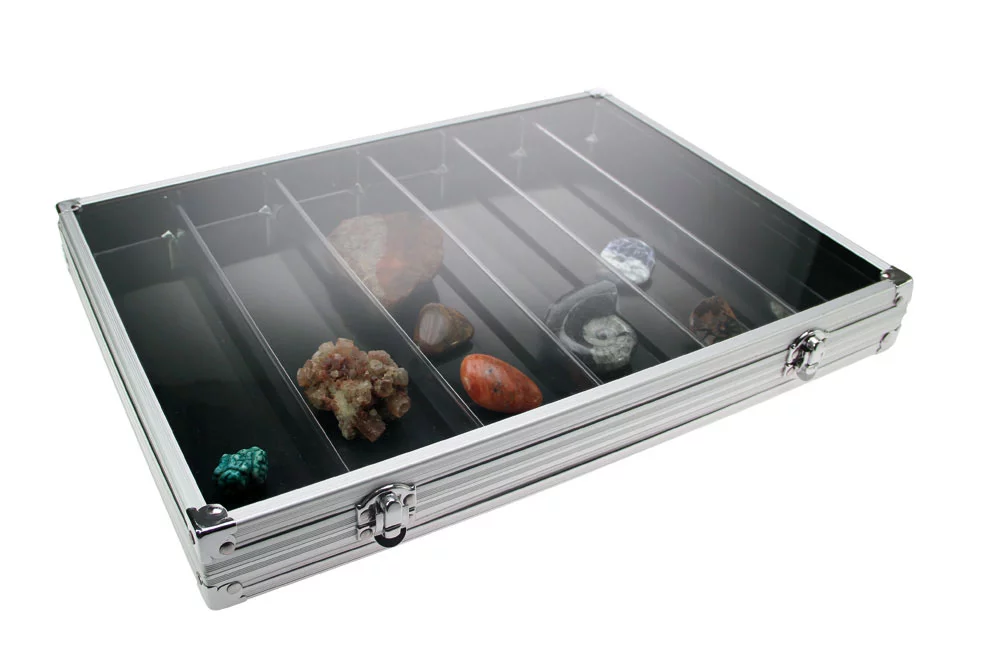 Deze stevige aluminium vitrinekast wordt geleverd blauw fluwelen interieur. Voorzien van 2 sloten. Dubbele scharnieren, over 90° te openen. Metalen versterkte hoeken en randen.