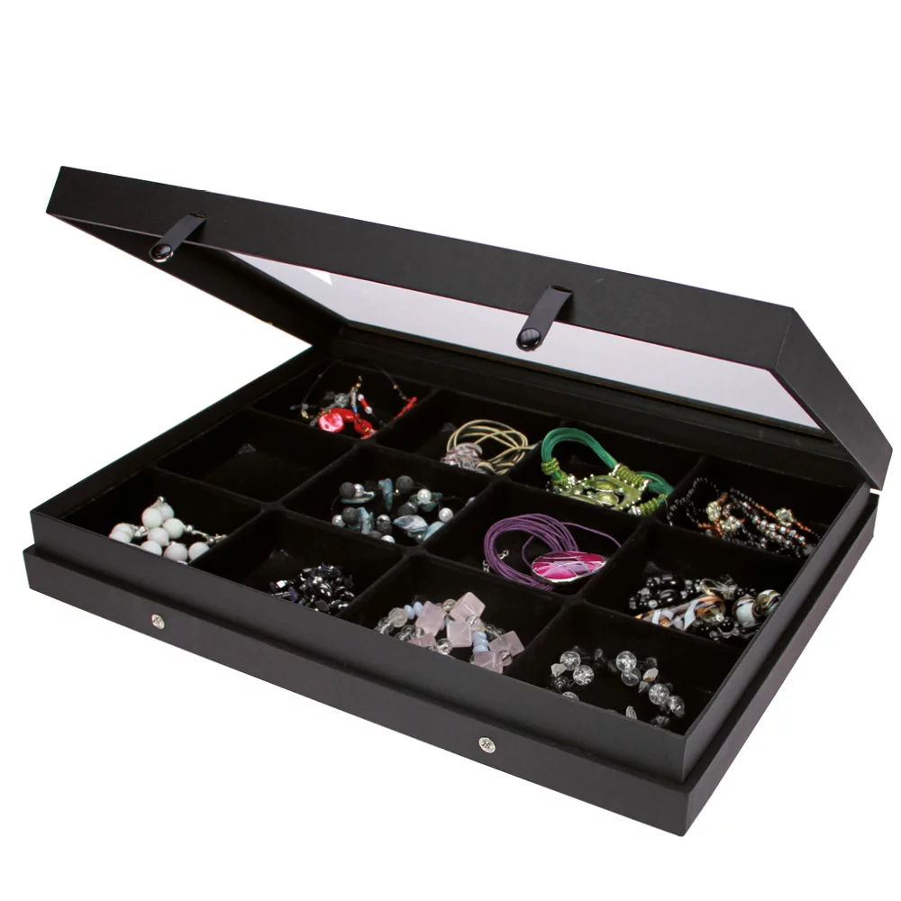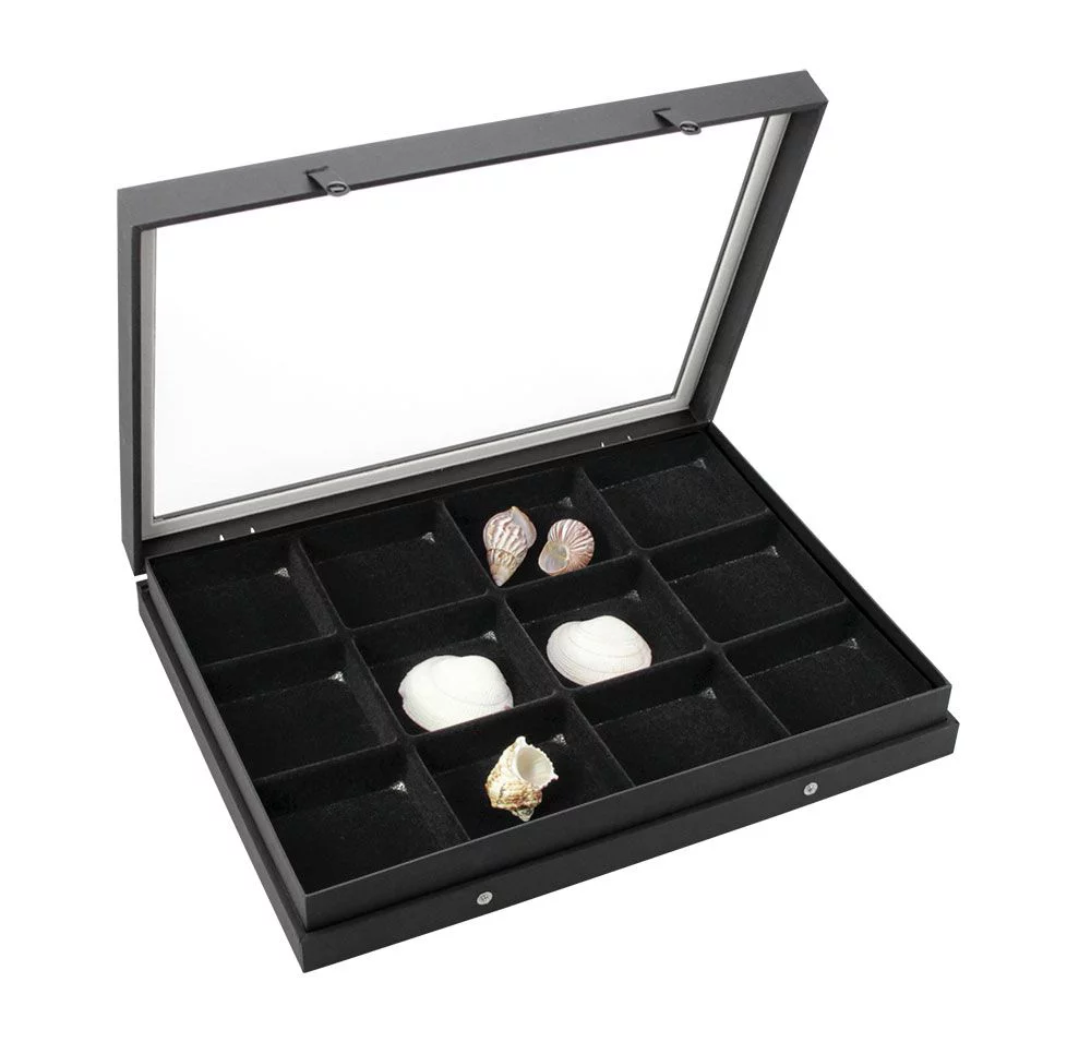 Tijdloos elegante presentatie display met glazen deksel. Stevige vitrine met een mat zwart linnen structuuroppervlak en 2 praktische drukknopsluitingen.