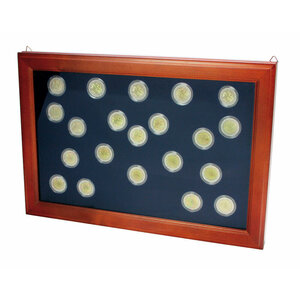 Munten vitrine, 21 x Ø 33 mm., 10 jaar Euro in capsules.