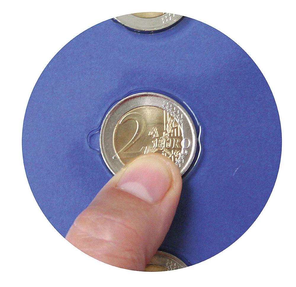 Gepatenteerde insteekbladen waar de munten in te drukken zijn. De munten zijn aan de voor- en achterkant te bekijken. U kunt u munten extra bescherming bieden, door er een beschermings hoes (SA.N-0007859) over te schuiven.