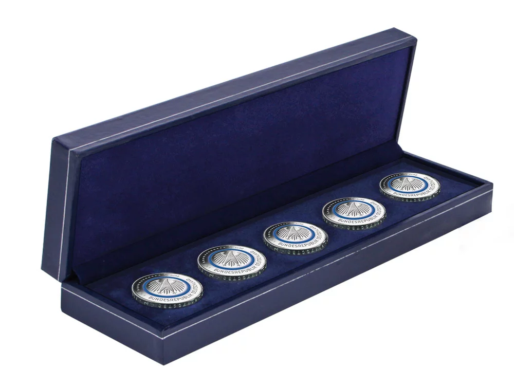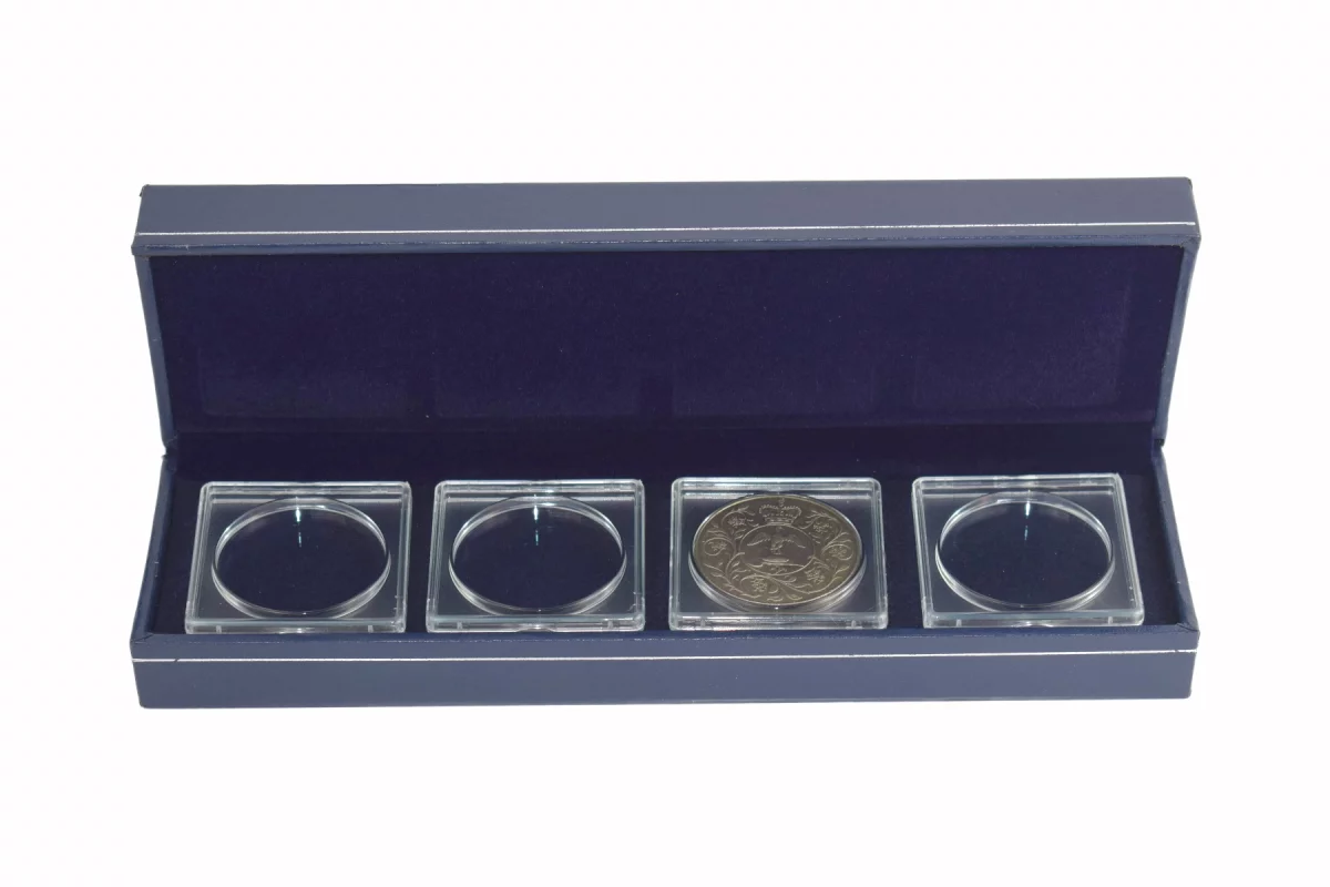 Hoogwaardige munten etuis in donkerblauw met zilveren reliëf, deze zijn ontwikkeld voor munten selectie naar keuze.