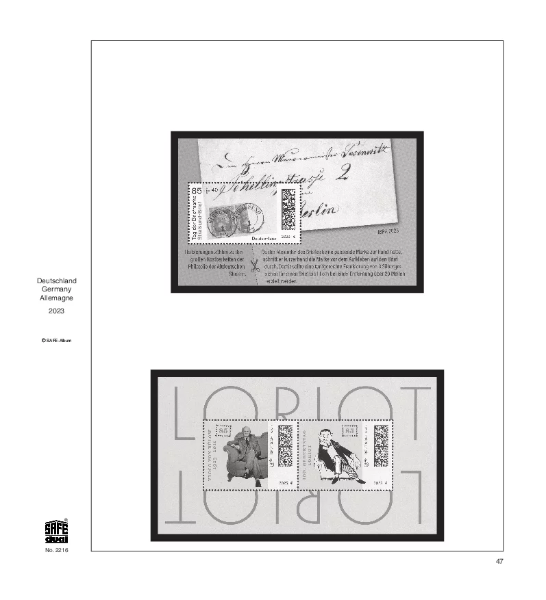 Met een formaat van 270 x 297 mm en een 14 Rings perforatie passen deze voordrukbladen perfect in de bijbehorende Safe albums, van het type Favorit, met 14 ringen. Elk blad is voorzien van zwarte kaderlijnen en afbeelding(en) uitgevoerd in het Zwart op bladen in de kleur Champagne, van bijv. postzegels, velletjes, postzegelboekjes enz. die thuishoren bij dit voorbedrukte album blad. Hierdoor krijgt u in één oogopslag een duidelijk overzicht van wat u al in uw bezit heeft en wat nog zou ontbreken. Zo houdt u uw verzameling overzichtelijk en up-to-date, ingedeeld per jaar of tijdvak.